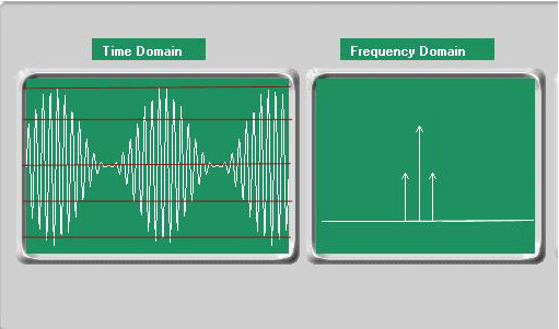 On the spectrum analyzer you'll notice that two more spikes have come up. Those represent the actual information that's being transmitted. In this case the information is a 1000 cycle tone. You'll notice that on the spectrum analyzer the carrier power didn't change at all. The new spikes are separate and distinct. The reason they are separate and distinct is because they make up what are called the "sidebands."