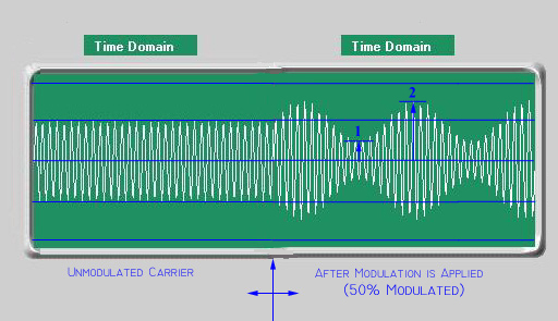 The graphic above shows an unmodulated carrier on the left side and a carrier being modulated to 50% by a pure sinewave on the right side.